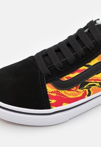Chaussure de skate basse en daim noir, semelle blanche et motif flammes rouge, orange et jaune sur les côtés et le talon.