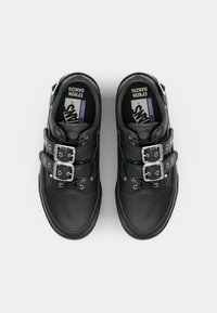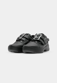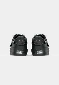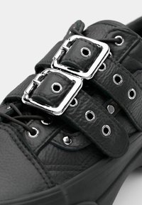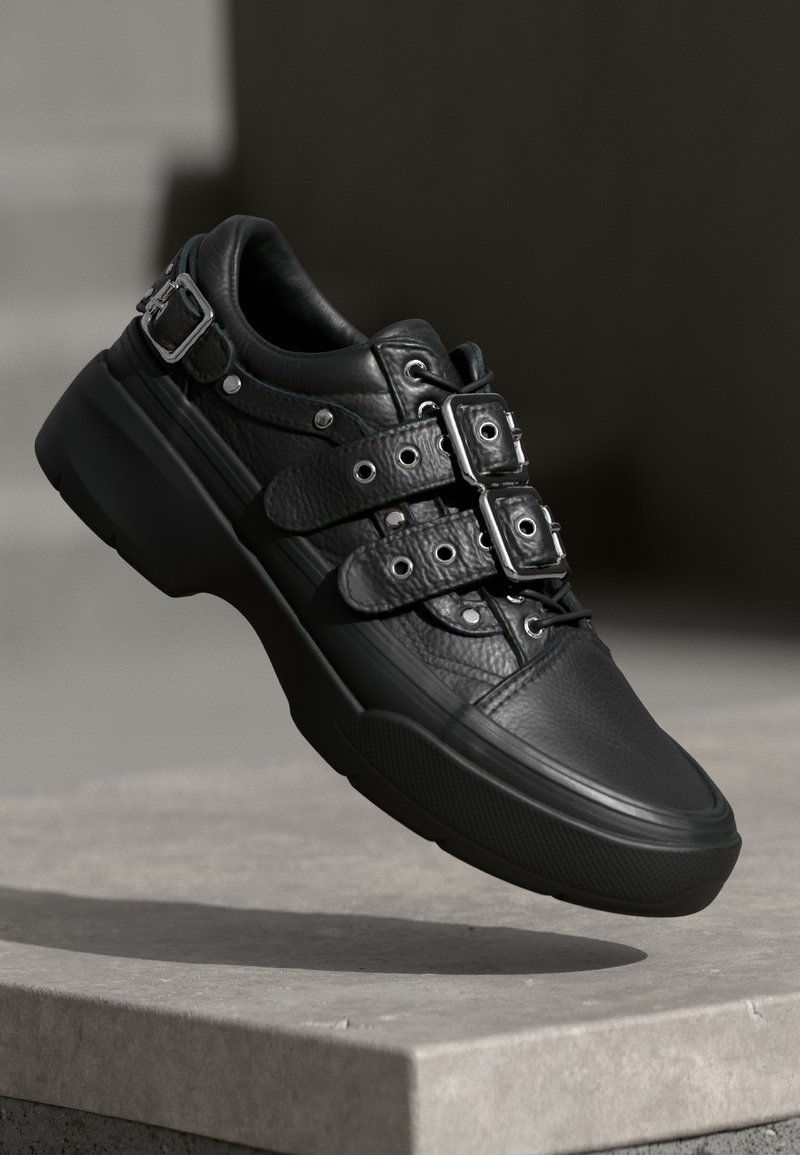 Baskets en cuir noir avec double boucle, lacets à l'avant et semelle épaisse en caoutchouc, posées sur une surface en pierre surélevée, avec un fond sombre.