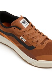 Chaussure de sport marron avec des accents orange et noir. Elle présente une tige en mesh texturé, une semelle rembourrée et un design classique à lacets.
