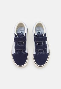 Baskets en toile rayées bleu marine et bleu clair avec des bandes Velcro, semelle en caoutchouc blanc et détail de logo rouge sur le talon.