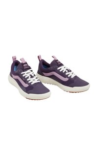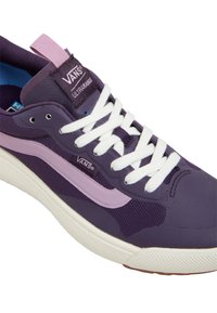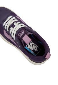 Baskets Vans basses violet et lavande avec lacets blancs, semelle crème texturée, et languettes de maintien sur la languette et le talon.