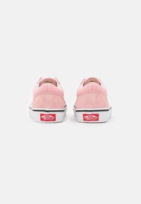 Basket en toile rose avec des lacets blancs et un design de rayures blanches. Présente une semelle en caoutchouc noire et un petit logo rouge sur le talon.