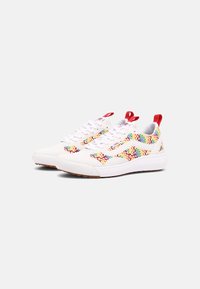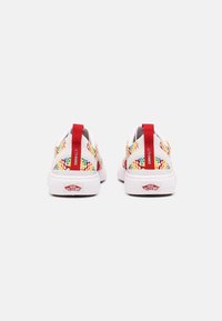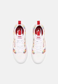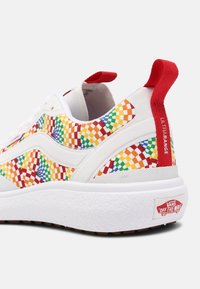Baskets Vans blanches avec un motif damier multicolore, languettes rouges, portées aux pieds sur un fond neutre.