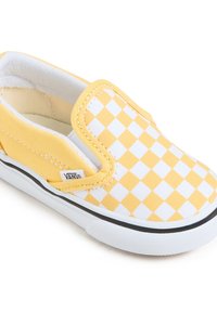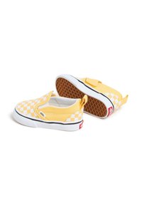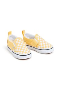 Baskets jaunes à enfiler avec un motif à damier, dessus en toile, doublure blanche, semelle noire et accent rouge au talon.