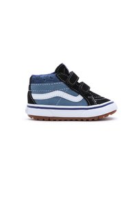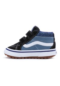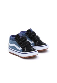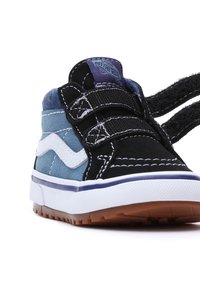 Baskets montantes noires et bleues avec des bandes Velcro, en suède et toile, coutures blanches et semelle en caoutchouc marron.