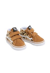 Bottines pour tout-petits en suède marron et tissu à imprimé léopard, avec deux sangles Velcro, semelle en caoutchouc blanche et bande latérale blanche.