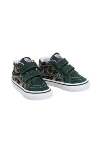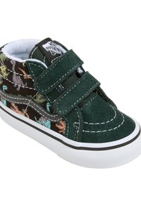Baskets montantes en suede vert avec deux bandes Velcro, tissu noir présentant des motifs colorés de dinosaures, semelle en caoutchouc blanc et détails de couture.