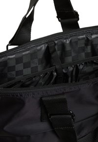 Personne en chemise violette tenant un grand sac fourre-tout noir Vans avec double poignées sur l’épaule.