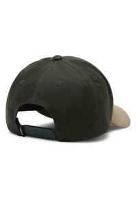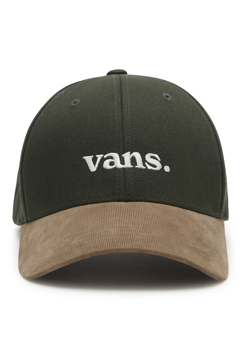 Casquette de baseball vert foncé avec une visière en velours côtelé marron et le logo "vans." brodé en blanc centré sur le panneau avant.