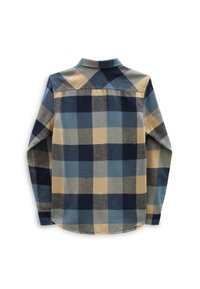 Chemise pour homme à manches longues avec un grand motif à carreaux bleu, beige et gris et deux poches à rabat à l'avant.