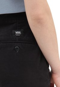 Pantalon noir avec une poche arrière, portant une étiquette avec le logo Vans, fermeture par bouton et texture de tissu lisse. Gros plan sur la zone de la ceinture.