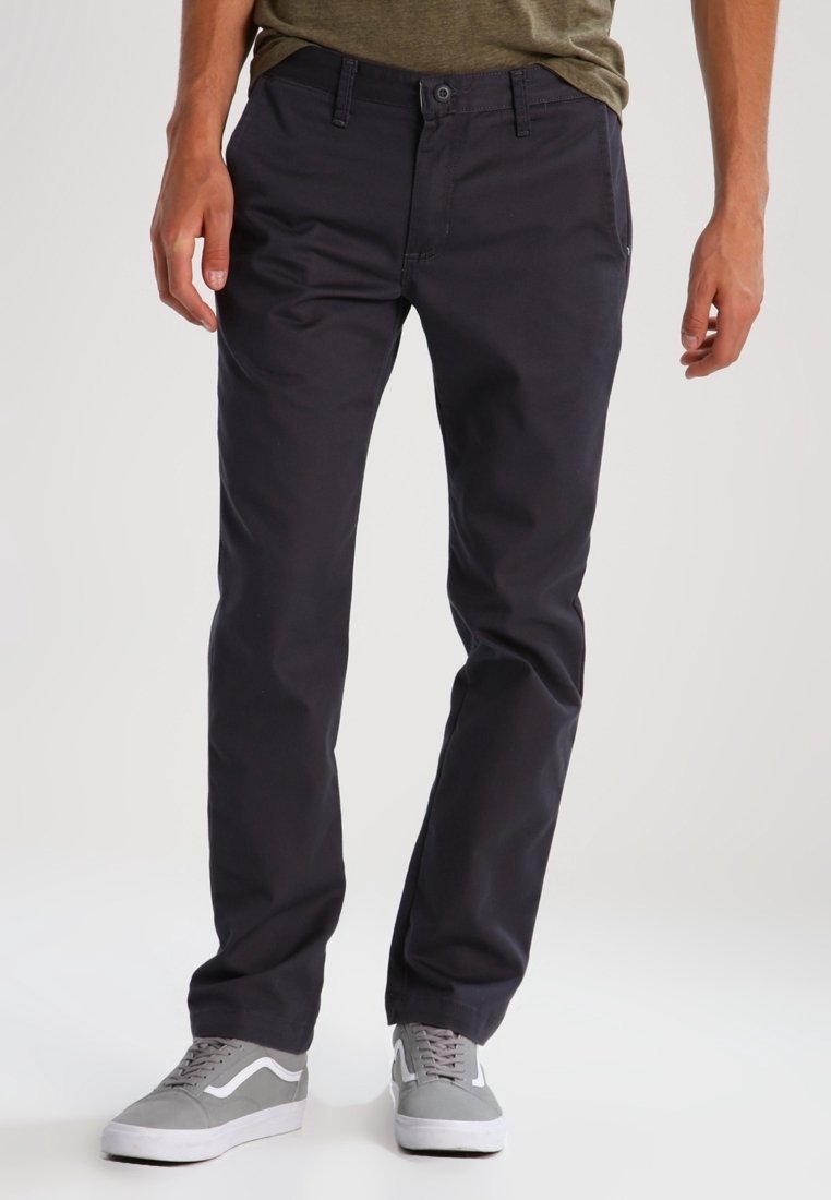 Homme portant un pantalon droit bleu marine foncé, des baskets grises et blanches, debout les mains le long du corps sur un fond uni.