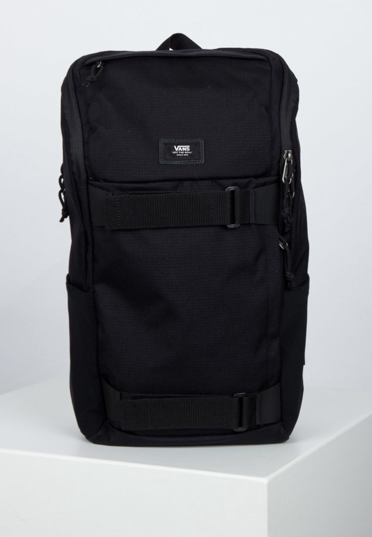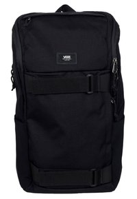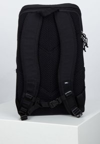 Sac à dos noir en tissu résistant, doté d'une poche avant, de bretelles réglables et d'un patch logo. Fermetures éclair robustes et poches latérales en filet.