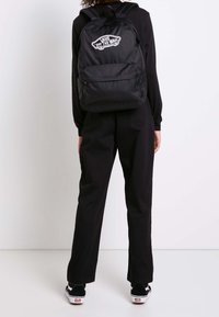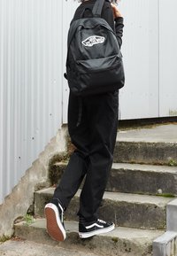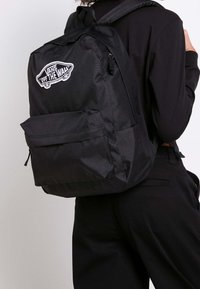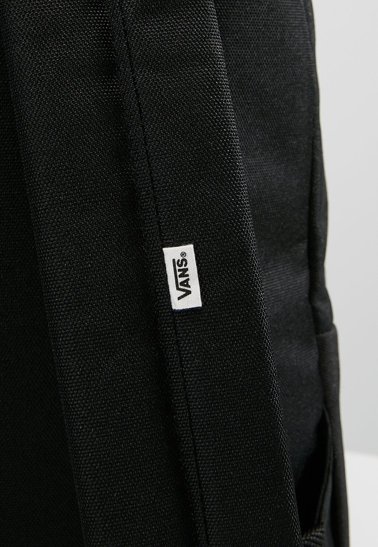 Gros plan sur la sangle d'un sac à dos Vans noir avec une petite étiquette blanche du logo Vans cousue dans le tissu.