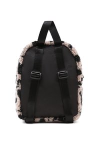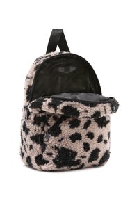 Petit sac à dos en peluche avec imprimé léopard noir et beige, poche zippée à l'avant et patch logo Vans noir sur le dessus devant.