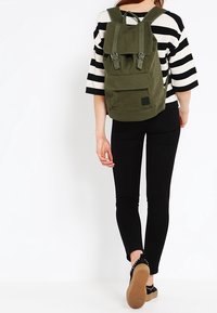 Sac à dos en toile verte avec fermetures à boucle, une poche frontale et des bretelles rembourrées. Associé à un pantalon skinny noir et des chaussures plates.