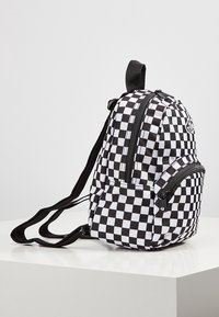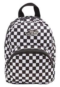 Personne portant un sweat à capuche noir et des leggings argentés brillants, avec un petit sac à dos Vans noir et blanc à carreaux sur le dos.