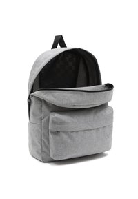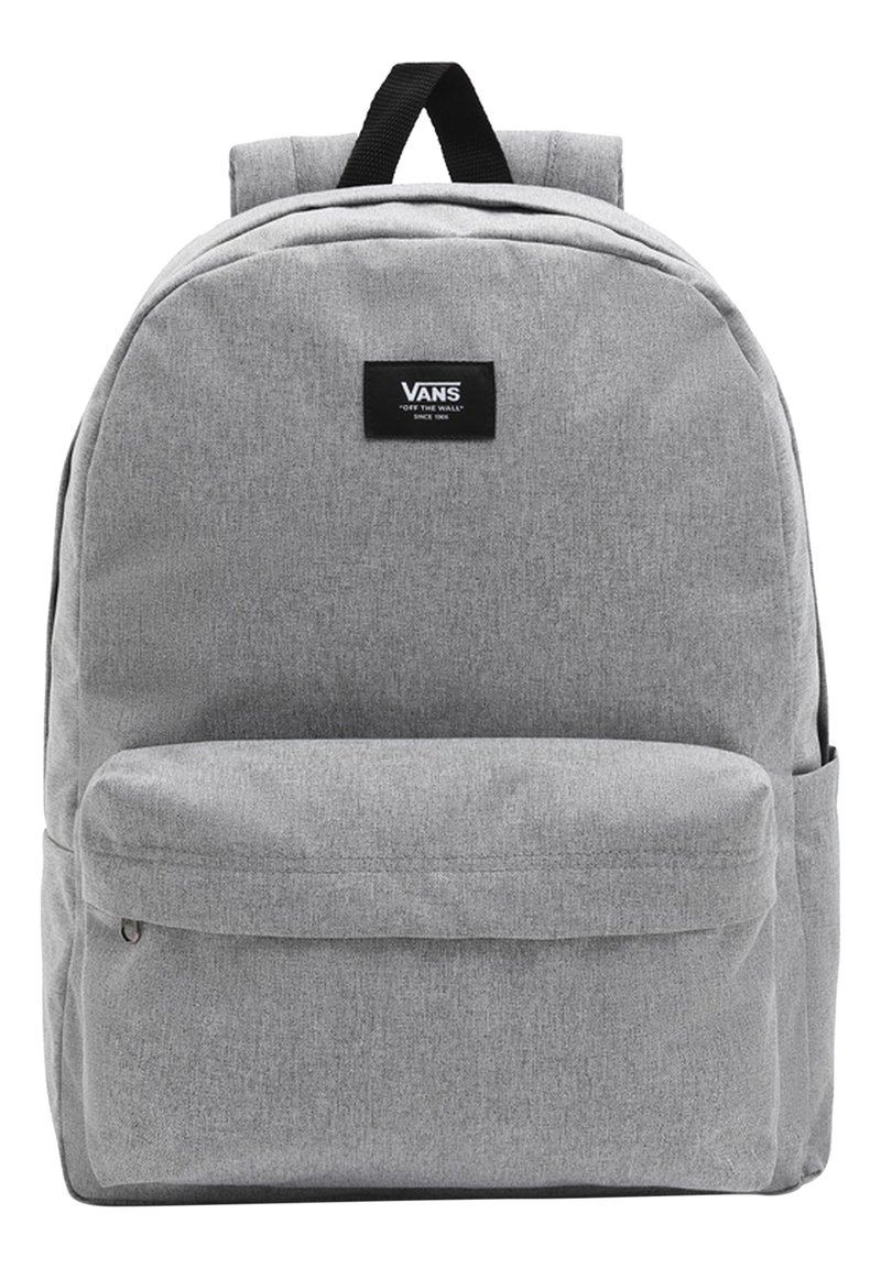 Sac à dos Vans gris clair avec un patch logo noir, une poche zippée à l'avant, des bretelles rembourrées et une boucle de poignée en tissu sur le dessus.