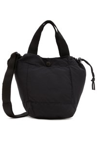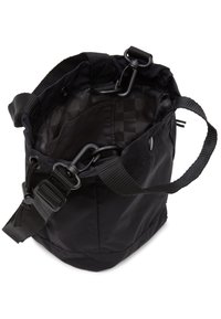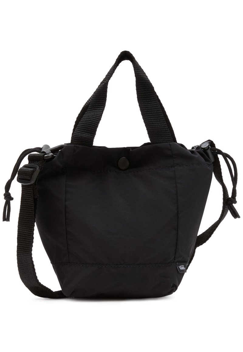 Petit sac fourre-tout noir avec poignées courtes, bandoulière réglable, côtés à cordon de serrage et fermeture par bouton-pression, étiquette Vans en bas à droite.