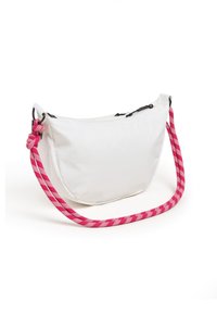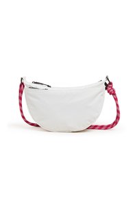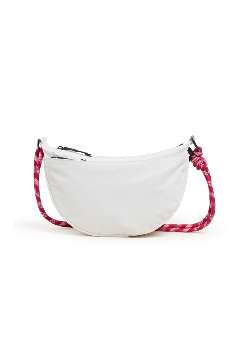 Sac blanc en forme de croissant avec une fermeture éclair noire et une bandoulière tressée rouge et blanche avec un détail de nœud.