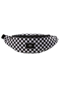 Banane en tissu à carreaux noir et blanc, avec une fermeture éclair sur le dessus et une sangle noire réglable. Patch logo à l'avant.