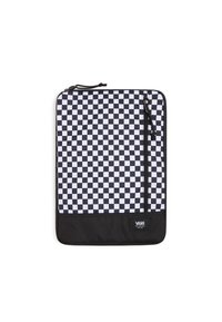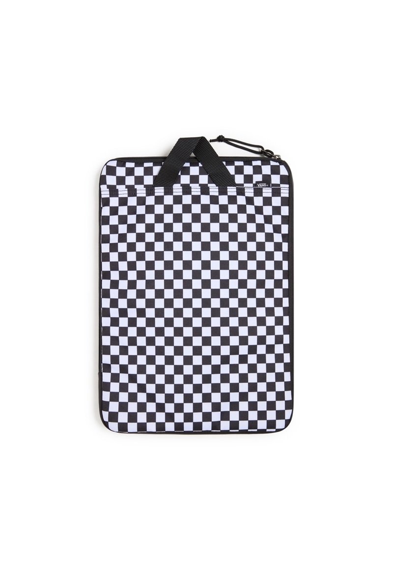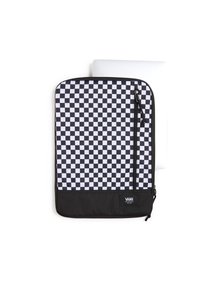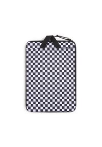 Manchon d'ordinateur portable en noir et blanc à carreaux avec fermeture éclair, poignet supérieur et design rembourré pour la protection ; forme rectangulaire avec une texture lisse.