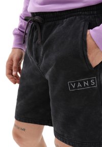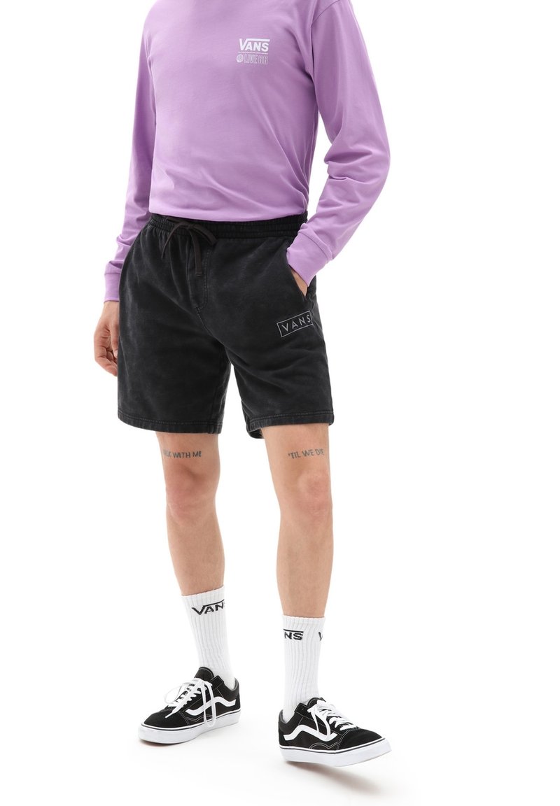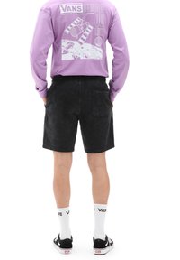 Shorts en velours côtelé noir avec une ceinture élastique et des poches avant, assortis à une chemise lavande à manches longues et des baskets noires avec des accents blancs.