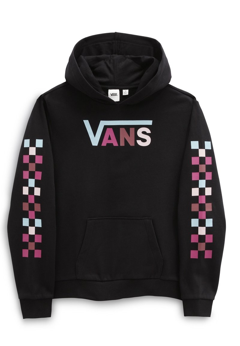 Haut à capuche noir avec un logo central "VANS" dans des couleurs pastel, et un motif damier de couleurs variées sur les deux manches.