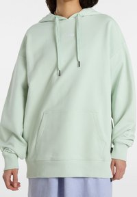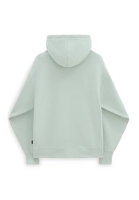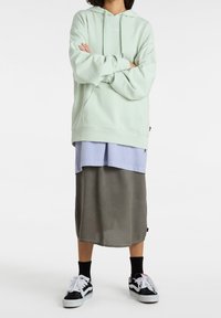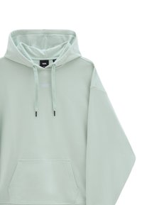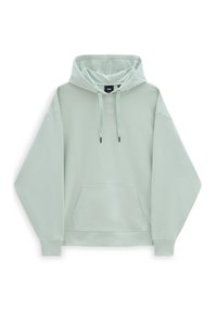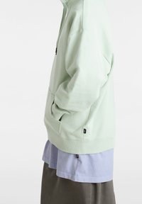 Personne portant un sweat à capuche Vans oversize vert clair avec poche avant et capuche à cordon, associé à un pantalon bleu clair.
