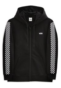 Personne portant un sweat à capuche zippé Vans noir avec des bandes à damier blanches sur les manches et un short blanc, tenant les cordons du sweat à capuche.
