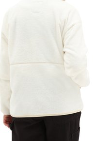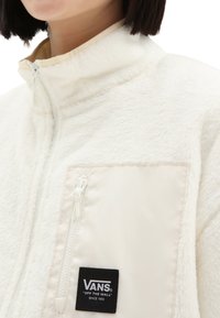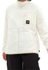 Personne portant une veste polaire blanche à fermeture éclair avec une poche poitrine zippée ornée d'un patch logo Vans, associée à un pantalon noir.