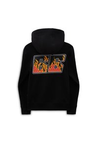 Hoodie noir avec poche kangourou à l'avant, logo "VANS Off The Wall Since 1966" en motif jaune-rouge sur la poitrine et texte sur la manche.