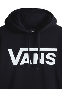 Sweat à capuche noir en mélange de coton, arborant un logo Vans blanc. Design comprenant des poignets et un ourlet côtelés, avec une coupe décontractée et une capuche ajustable.