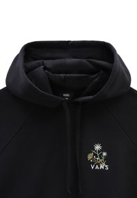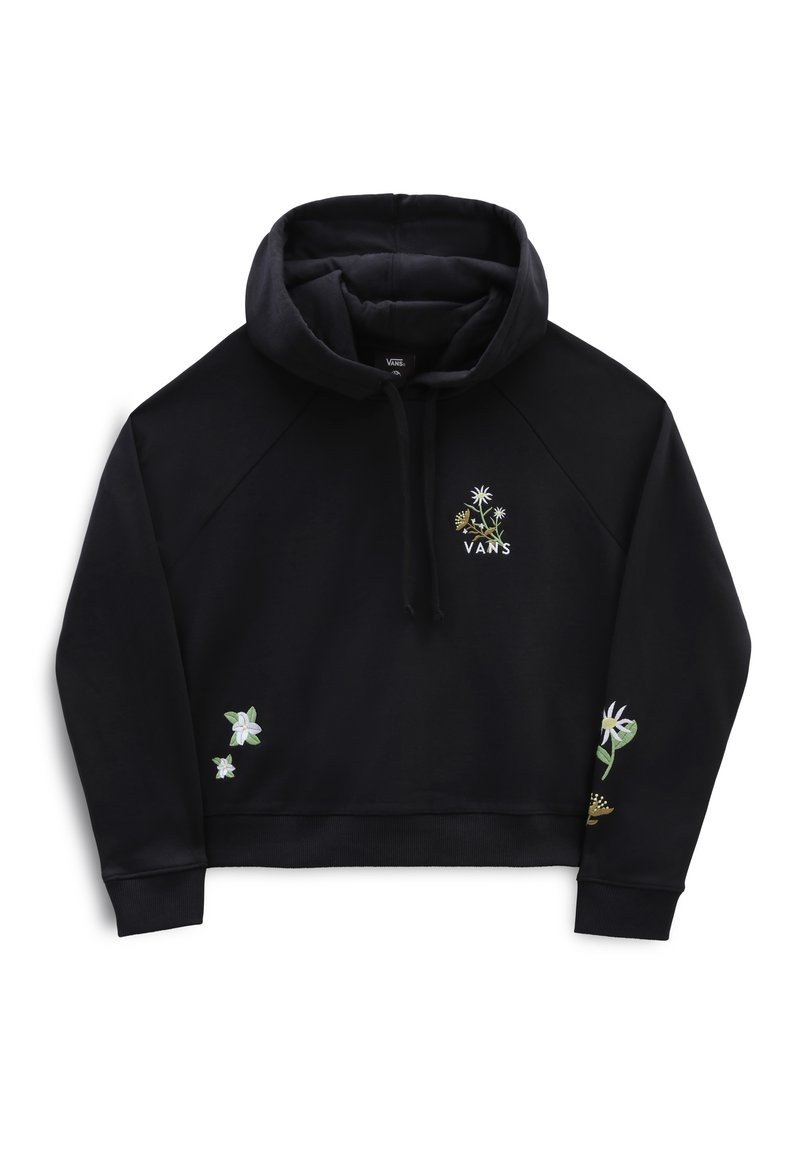 Sweat à capuche noir Vans avec broderie florale sur la poitrine, le côté inférieur gauche et la manche droite, présentant des marguerites et des feuilles vertes.