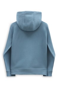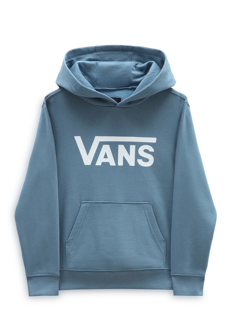 Sweat à capuche bleu avec poche avant et grand logo Vans blanc sur la poitrine, posé à plat sur un fond blanc.