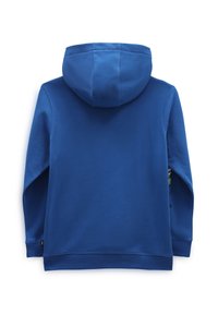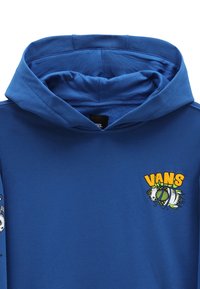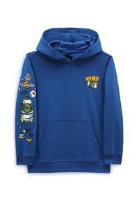 Sweat à capuche bleu en coton, avec une poche kangourou et des motifs de planètes et d'une fusée sur la manche gauche. Logo "VANS" brodé.