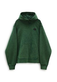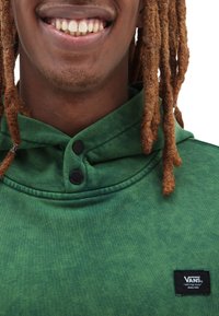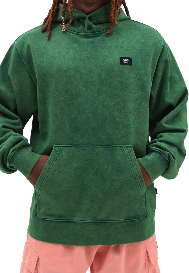 Personne portant un sweat à capuche Vans vert avec poche avant et boutons au col, assorti à un pantalon cargo rose, les mains dans les poches.