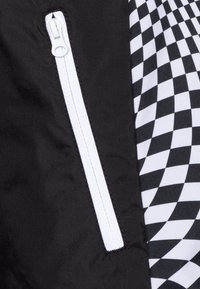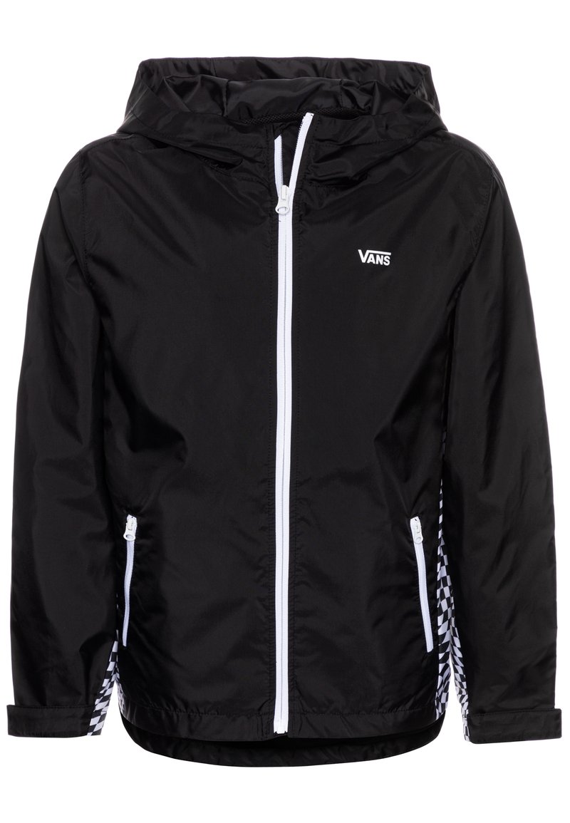 Veste à capuche noire Vans avec fermeture éclair blanche sur le devant, deux poches latérales zippées et motif damier sur les côtés.