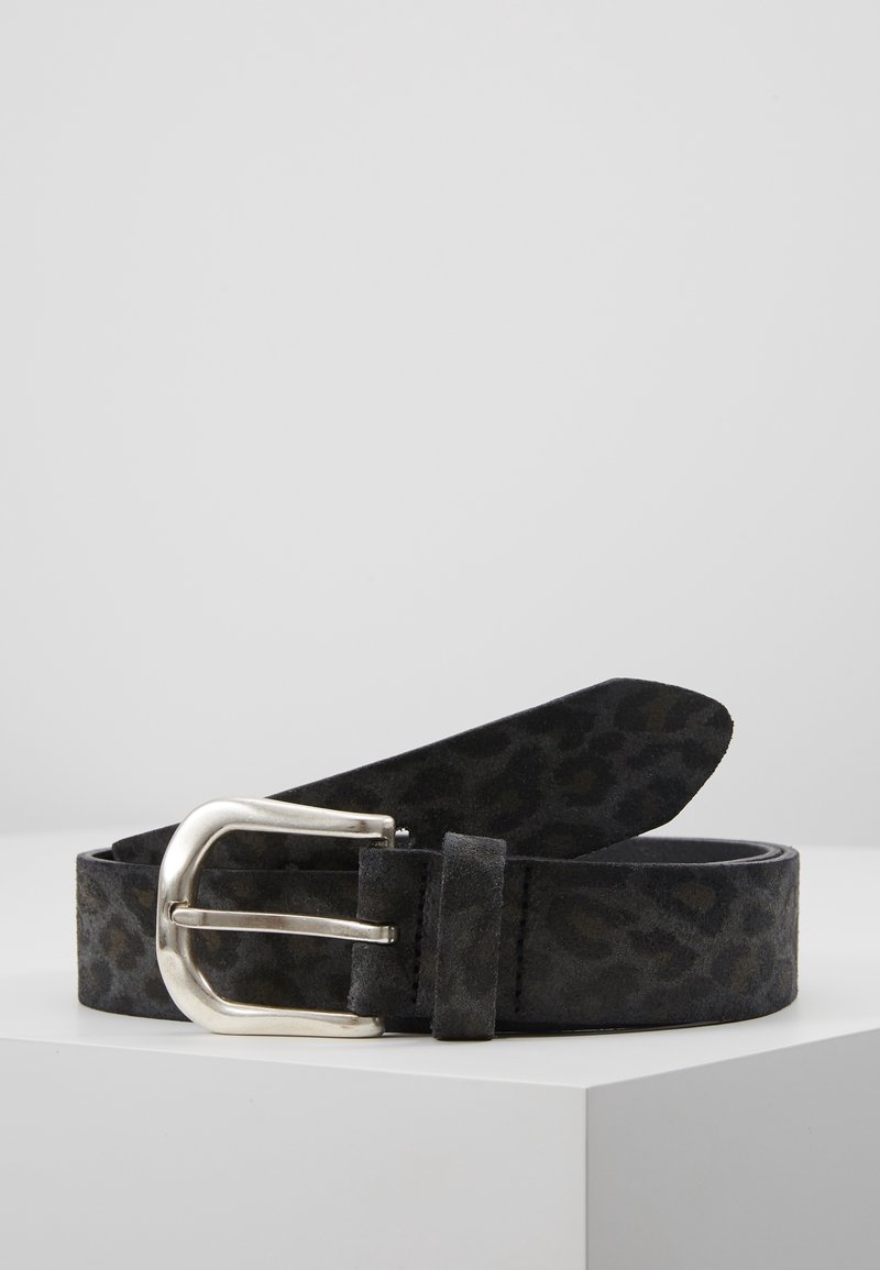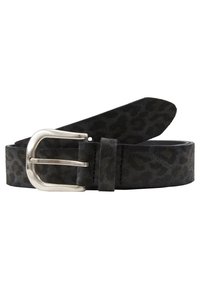 Ceinture en daim noir avec un motif subtil de léopard, boucle en métal argenté et une seule boucle, présentée enroulée sur une surface blanche.