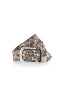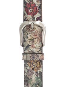Ceinture à motif floral avec une boucle en métal argenté, présentant des fleurs multicolores sur un fond clair texturé.