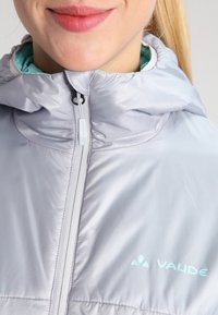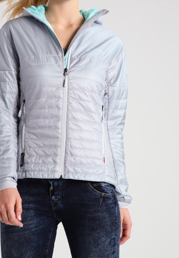 Femme portant une veste matelassée gris clair avec doublure de capuche turquoise, fermée par une fermeture éclair, associée à un jean bleu foncé sur un fond uni.