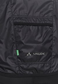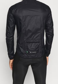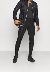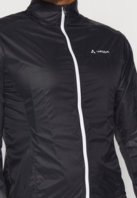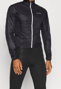 Veste de cyclisme noire légère avec un col montant, une fermeture éclair intégrale et des poignets élastiques. Fabriquée en matériau lisse et résistant à l'eau.