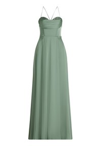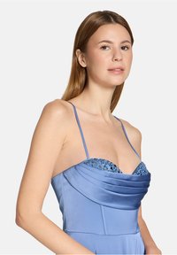Robe de soirée bleu clair avec un corsage drapé et des bretelles fines. Tissu lisse et fluide avec une taille cintrée et une jupe ample. Détails en dentelle au niveau du décolleté.