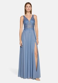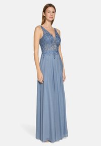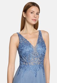 Femme debout portant une robe de soirée bleue sans manches avec un corsage en dentelle florale et une fente haute sur la cuisse, expression neutre, fond uni.