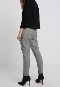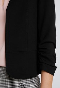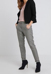 Blazer noir cintré avec manches trois-quarts porté sur un chemisier rose clair. Pantalon taille haute à carreaux gris et noirs. Fermetures invisibles.
