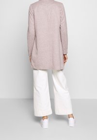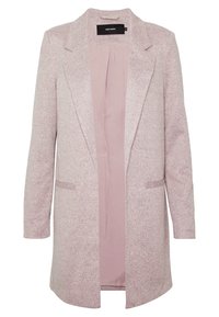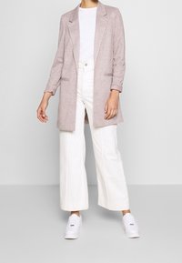 Femme portant un blazer ouvert texturé rose clair, un t-shirt blanc et un pantalon blanc taille haute sur un fond uni.