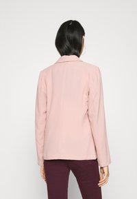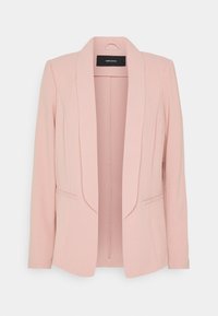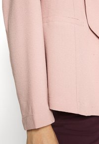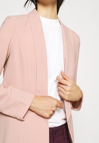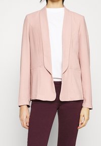 Personne portant un blazer ouvert rose pâle sur un haut blanc avec un pantalon violet foncé, debout devant un fond blanc uni.