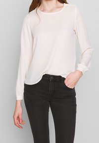 Femme portant un chemisier crème à manches longues avec des boutons aux épaules et un jean noir taille haute, une main dans la poche, sur un fond uni.