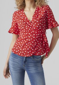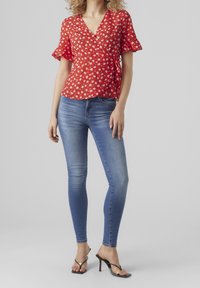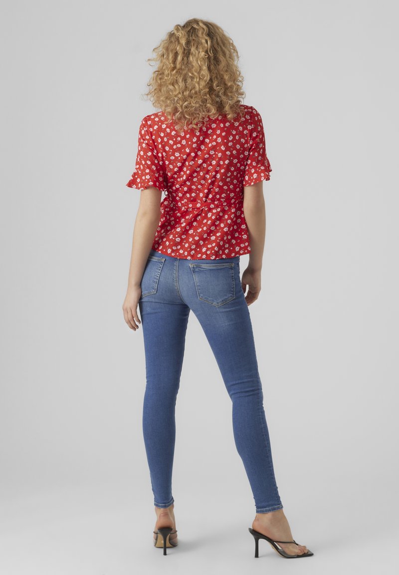 Femme aux cheveux blonds bouclés portant un chemisier rouge à fleurs, un jean skinny bleu et des sandales noires à talons, debout de dos.