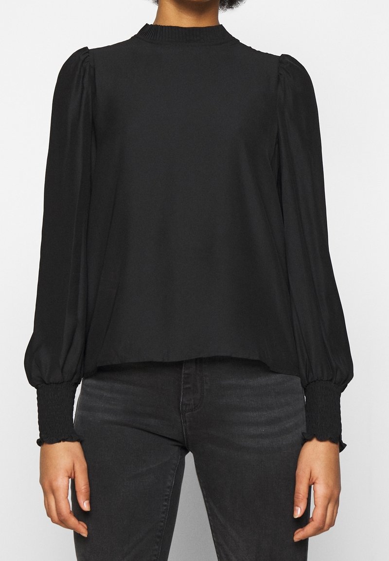 Blouse noire à manches longues avec un col haut, des manches bouffantes et un smocké texturé aux poignets. Tissu lisse avec une coupe décontractée.